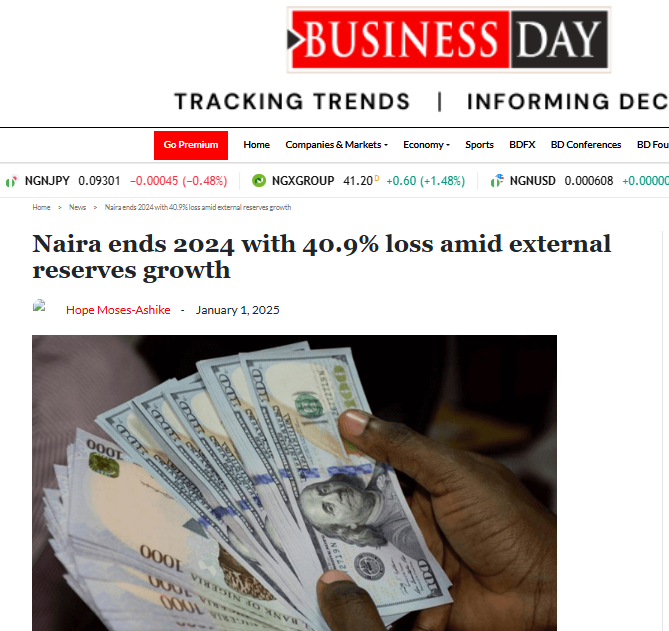 According to businessday, Naira lost over 40% of its value in 2024 alone